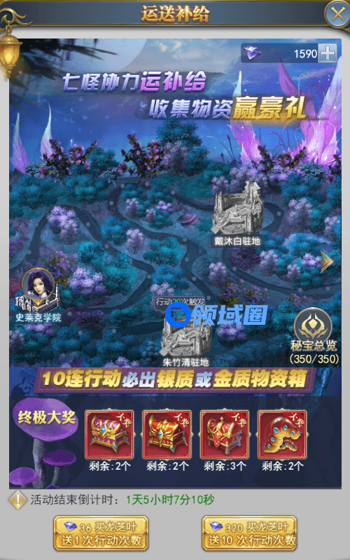 通过钻石单抽/十连抽(9折)购买龙芝叶,赠送行动次数,开启物资箱抽取奖励;