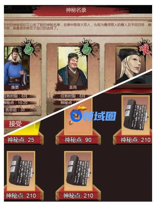 3.击败对方后回到唐门提交任务即可领取相对应的神秘点与善恶值。(图为神秘名录、神秘商店)