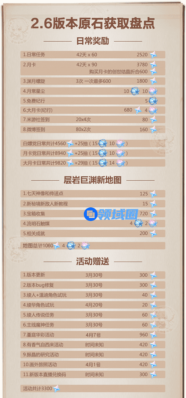 2.6版本维护补偿、2.6版本bug修复、21天日常奖励、三次米游社签到 一次微博签到、绫人角色试玩、温迪角色试玩、绫人传说任务、魔神主线任务、两期深境螺旋、4月月常兑换、21天月卡奖励(月卡党)、纪行前半段(大月卡党)、一次月卡购买(月卡党)、层岩巨渊地图、堇庭华彩活动、画外活动