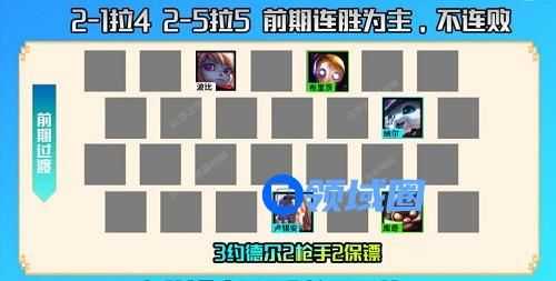 11.前期阵容:2-1拉4人口,2-5拉5人口,前期优先拿3约德尔保镖枪手打工过渡,选秀的时候有卢锡安就直接拿卢锡安,不要考虑任何装备,优先做出2星卢锡安=3阶段连胜。前期保镖约德尔枪阵容核心点在于卢锡安,有电刀的1星卢锡安在2阶段强度非常高,如果不遇到天胡2星3费基本是5连胜,3阶段则需要2星卢锡安+电刀+任意一个装备帽子/法爆/正义之拳,两件套2星卢锡就能够在3阶段连胜。因此这里的运营思路是,小嗨最近打的比较多的3-1直接拉6人口去找2星卢锡安和前排质量,卢锡安一到2星就停手。连胜的经济能够保证我们在4-1拉7人口并且有50金币。