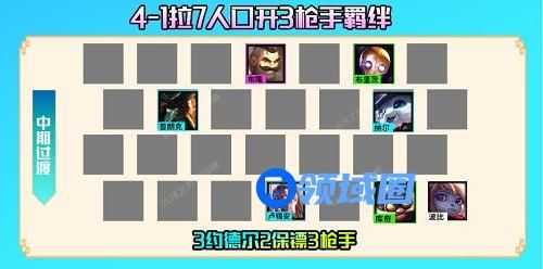 12.中期阵容:3-6/4-1两个阶段拉7人口,如果前期是连胜经济不错的情况下,优先提速拉7人口。这里拉7人口能够尽快的嫖到全阵容2星,其次补充蕾欧娜/布隆开2保镖支撑阵容前排,补充船长开3枪。全员2星中期4阶段过渡上8难度并不大,即使输了也是掉一两个怪影响不是特别大,中期速八即可。