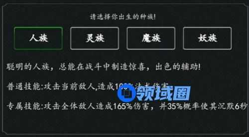 2、人族:中后期选手,前期会比较弱势,当有一定装备后,人族在挑战boss,有独特妙处,种族技能为沉默效果,谁用谁知道,特别中后期,大部分挑战都在比拼谁能更高效的进行技能释放。