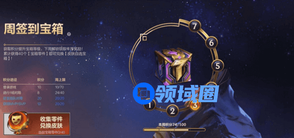 10%概率获得宝箱零件,只能概率获得一个常规奖励(蓝色晶石*95,魄罗币*30,3胜双倍晶石卡,队伍加成卡*2,全英雄畅玩卡)