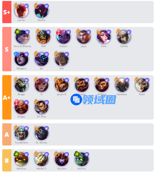 2、T1梯队 瞎子螳螂地位稳固;奥拉夫、努努都是容错高,又扛得住的类型,在野区一直都很吃香;剑姬、杰斯、打野比较冷门;然后莫甘娜打野又是完全不一样的画风;强烈推荐卡密尔、贾克斯做神圣分离者这件装备。