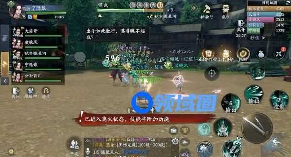 2.【燃身成仁】如图所示,谭武会点燃自己,其后的攻击都会附带灼烧效果,如果你的身上叠了超过5层的灼烧DEBUFF,之后每次受到攻击时都会发生火焰爆炸,受到大量的伤害。因此我们在打这个首领的时候,时刻要关注自己身上的DEBUFF,一旦被谭武打到灼烧5层,那么就要尽可能远离BOSS攻击范围。