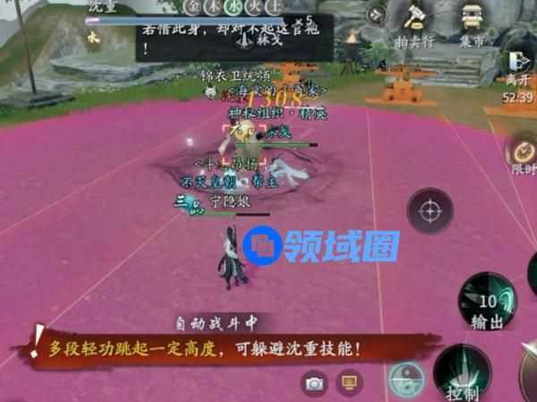 9.二技能【顺昌逆亡】,沈重在施放后会在地面出现一个巨大的红圈。玩家可以通过多段轻功跳到一定的高度,来规避该技能。当然,对于轻功不是很自信的小伙伴,直接使用轻功+位移技能跑出圈外也是不错的选择。