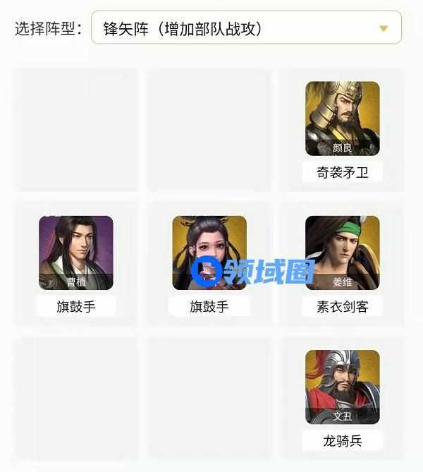 此阵容的核心是颜良、文丑的输出组合技,锋矢阵能够给颜良、文丑均提供高额的战法输出。颜良抢先出手给敌军加上标记debuff,文丑输出瞬间爆炸。