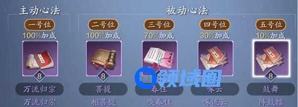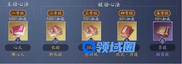 这套心法是目前大部分周卡/月卡少侠的配置。可能各位少侠的心法等级略有不同,但是组合都是大差不大的。这套组合完美的结合了攻守兼备——如果练武的等级够高,还可逐步提高到1号位置;如果有两本练武那是最佳组合,可将杀菩提进行替换。当前主动心法也可以使用流毒,看各位少侠之前门派的主动心法来决定。