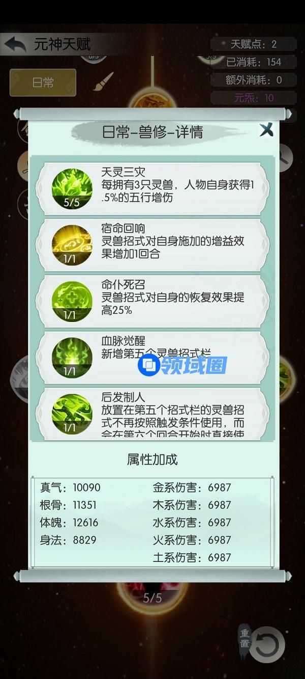 灵兽招式最上面那格带会心一击,其中的灵兽三灾是五行增伤,想增加五行抗性的话就点对面的御魂武布