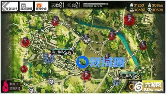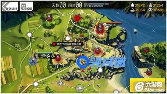 在战斗菜单选择“作战任务”或“模拟作战”关卡后,出现在指挥官面前的是一张战术地图。在战术地图上,用蓝色表示我方占领的据点,红色表示敌方占领的据点,白色表示未被占领的据点。