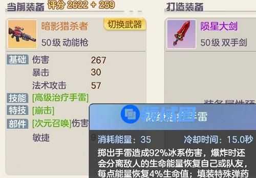 2、副武器可以根据守护者自己喜好选,推荐动能枪,特技和主武器一样的选择,武器技能可以选择“高级治疗手雷”,手雷命中后恢复自己和队友生命值。(当然双特技肯定是优先考虑的)