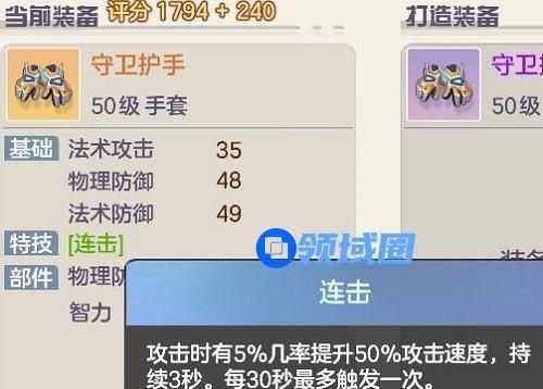 5、手套,通用特技考虑“易成长”或“强壮”;部位特技可以考虑“连击”或“残心”,连击触发时提升50%攻速,残心可以在击败敌人后恢复能量,作为机械师这点能量还是很有效果的。