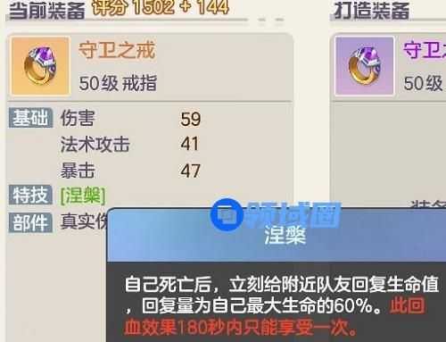 7、戒指,通用特技考虑“易成长”或“强壮”,部位特技可以考虑“涅槃”或“药香”,涅槃在自己死亡时可以恢复队友上限的60%生命值;而药香则可以提高恢复药水的效果,和治愈扩散完美配合,治疗量更大,超级奶妈。