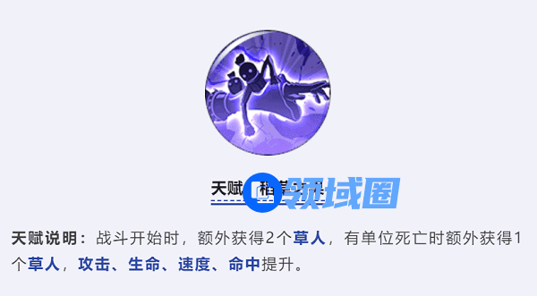天赋说明:战斗开始时,额外获得2个草人,有单位死亡时额外获得1个草人,攻击、生命、速度、命中提升。