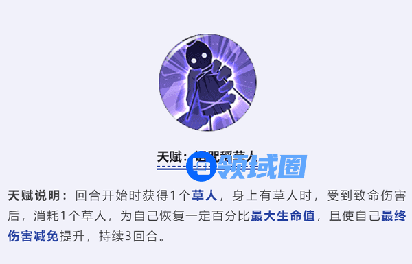 天赋说明:回合开始时获得1个草人,身上有草人时,受到致命伤害后,消耗1个草人,为自己恢复一定百分比最大生命值,且使自己最终伤害减免提升,持续3回合。