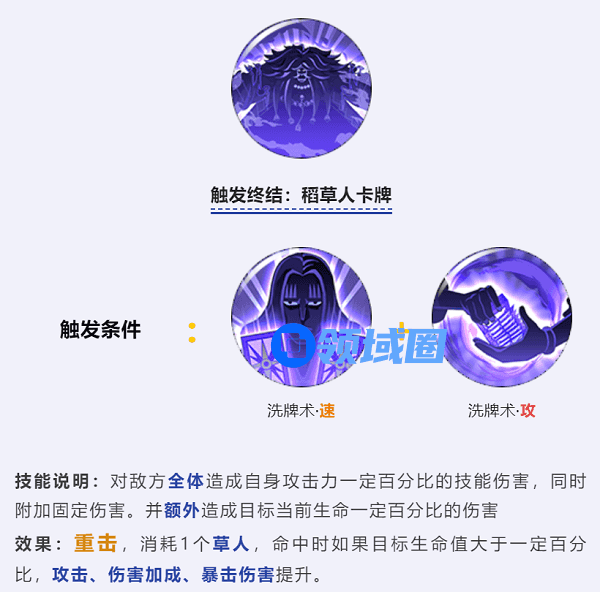 效果:重击,消耗1个草人,命中时如果目标生命值大于一定百分比,攻击、伤害加成、暴击伤害提升。