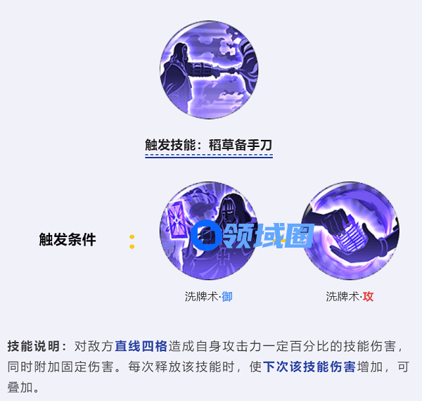 技能说明:对敌方直线四格造成自身攻击力一定百分比的技能伤害,同时附加固定伤害。每次释放该技能时,使下次该技能伤害增加,可叠加。