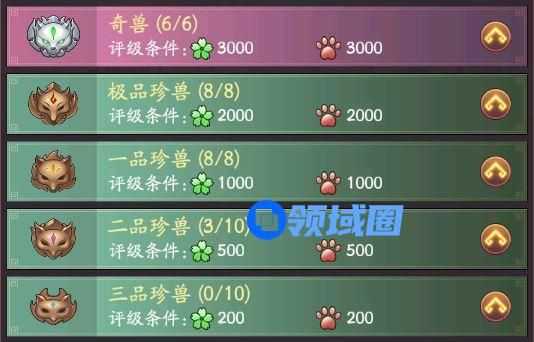 评级提升可以带来全门客资质提升,财力加成比较大,新活动饕餮盛宴很适合用来提升评级,一般先喂养常用技能的珍兽(八卦龟,金豆,阿吉,火狐,鹦鹉,令虎,卧龙)看个人喜好进行培养;评级升级一般选择平均培养,每个目标养满后换一只继续。