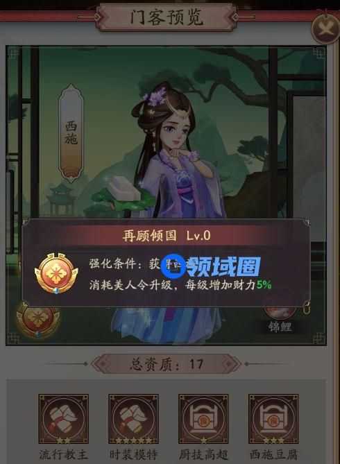 资质提升主要通过资质卷轴、万能卷轴、资质经验3个途径;资质等级和门客等级相同,目前满级最高400级。