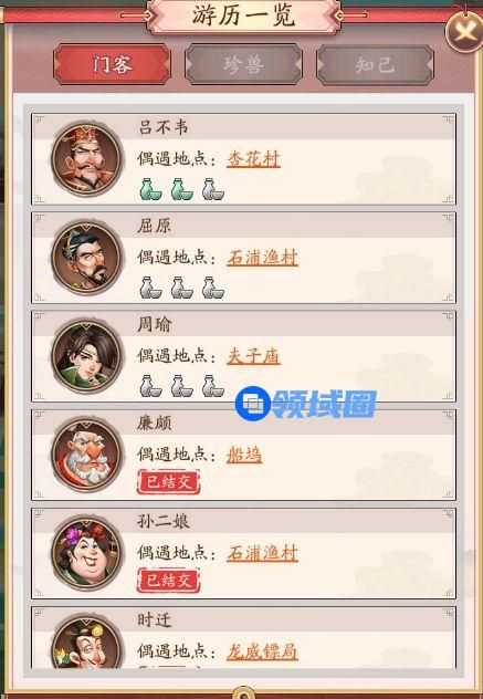 3、在游历玩法中,我们可以结交到许多实用的门客,游历的时候经过偶遇地点时,有概率触发提高相应门客的好感度,当好感度达到满值,我们就可以与这名门客进行结交了。而且游历的时候也可以获取到与门客相关的专属珍兽,大家可千万记得要及时进行游历噢!