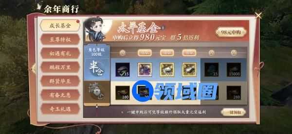 2、太平基金(98元):行走江湖首当其冲的自然是元宝,那么微氪玩家绝对要拿下的就是拥有超5倍返利的太平基金,随着人物角色的提升,每阶段都可以领取到储备元宝,在达到100级时累计可获得5050储备元宝的返利!(提示:储备元宝除不能从集市的商行中购买物品外,与充值元宝没有任何区别。我们可以用来购买如后续每周开启的余年镖行、余年华服等时装和坐骑等等)