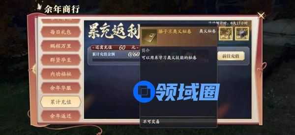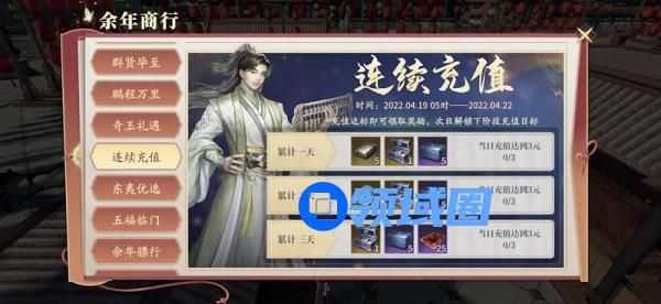 3、余年商行-连续充值(小额每日充值,每期价格不同):作为商业天才范思辙开办的周期充值活动,每个活动期间均赠送超值好礼,只需当日达成充值标准,次日即可解锁下阶段目标。每期奖励均不同,特别是对于当前的玩家来说,如元灵芝、珍宝匣、月魄石等材料简直是满满的爱。
