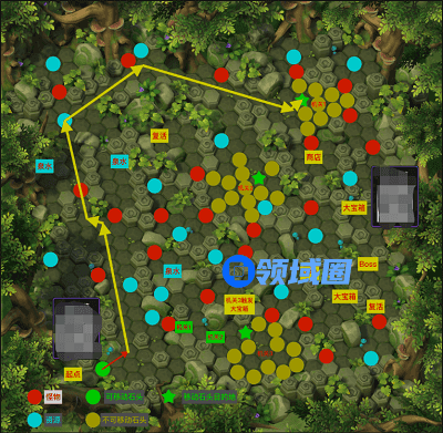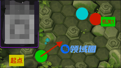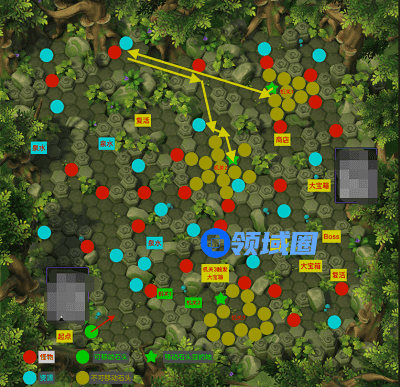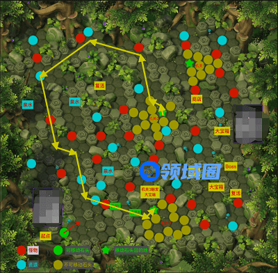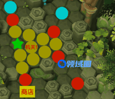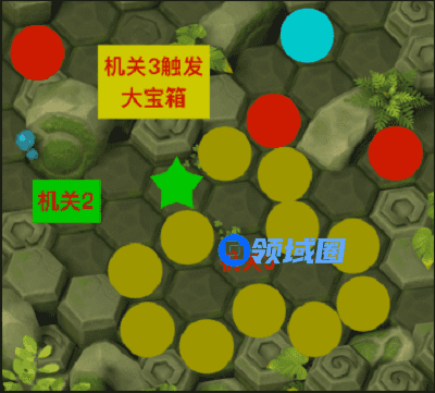 这幅图是NPC、资源、怪物与Boss的分布图,其中红色圆圈是怪物,蓝色圆圈是资源,绿色圆圈是可移动石头,这个石头是本图的关键,用来解锁三个石头阵,如图。