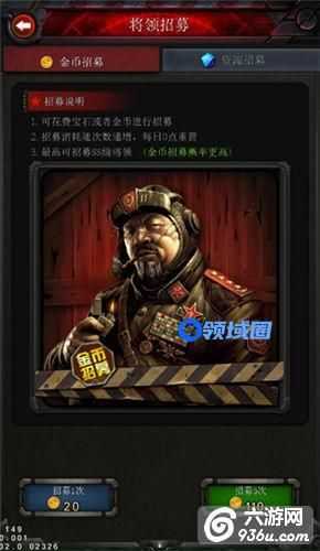 将领需要招募获得,有金币招募和资源招募两种形式。其中金币招募将有极大的概率获得品质更好的将领