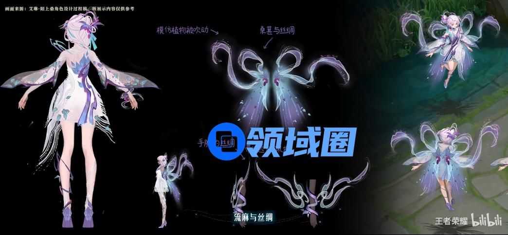 蚕丝化为丝绸环绕其身,扇形框景印记显现。地面四周蚕丝蜿蜒成环,将美好织进身边。