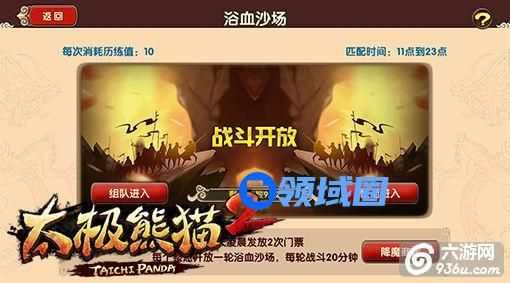 《太极熊猫2》热血大场面,野外交互实时竞技!震撼团战,多人同屏超强对抗!首推战场军衔系统,全民皆兵捍卫至高荣耀!端游MMO元素完美移植,25vs25团队作战,即时操控突破束缚,打 造超震撼的史诗级战场!每天凌晨系统会给所有玩家发放2次进入机会(可积攒上限为12次),等级满足25级的玩家可以在每天的11:00-22:30参加 浴血沙场的征战,奋勇杀敌,建功立业。在活动时间内每个整点将开启一轮战斗,共计12场,每轮持续20分钟。(建议在WIFI环境下进入活动)