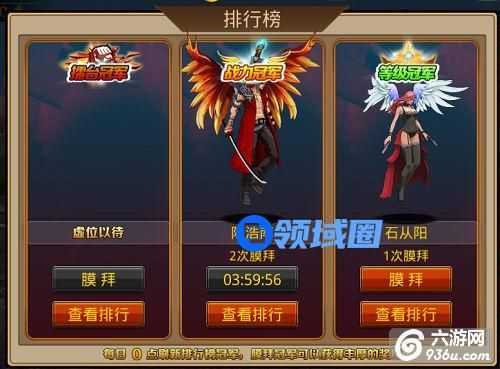 除排行榜冠军外,其他玩家都可以膜拜擂台、战力榜、等级榜第一的玩家一次,间隔时间为4小时,膜拜可以获得马仔券和钻石奖励,并可获得对方打赏的钻石,膜拜有机率获得大奖