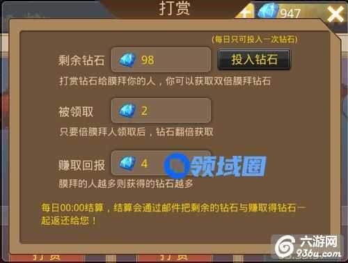 只有擂台、战力榜、等级榜第一的玩家可以打赏,根据情况可以打赏100、200、300钻石,其他玩家膜拜是可以获的打赏的奖励,每被其他玩家膜拜一次,你就获得双倍钻石,最后获得的奖励,每日0:00结算的时候发放。