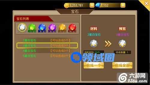 在宝石的中间有一个宝石合成按钮,点击该按钮可进入到宝石合成界面。选中对应品质的宝石,下面会列出可合成的个数。
