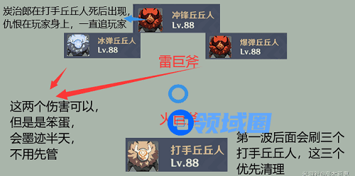 巨斧丘丘人应对方法:打死炭治郎后会刷新两个巨斧,其中火斧的仇恨是比较容易吸引的,一般清理完三个打手丘丘,炭治郎会飞快跑你面前,你在打手丘丘那位置等着炭智郎就好了,清完立马就吸引到火斧丘丘的仇恨了,剩下的该输出就输出。