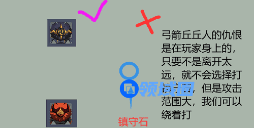 弓箭手丘丘人应对方法:尽量往图中打勾位置绕,不要让弓箭手丘丘人跟你中间隔着镇守石,,不然会被打,像图中打×位置就是会误伤镇守石。