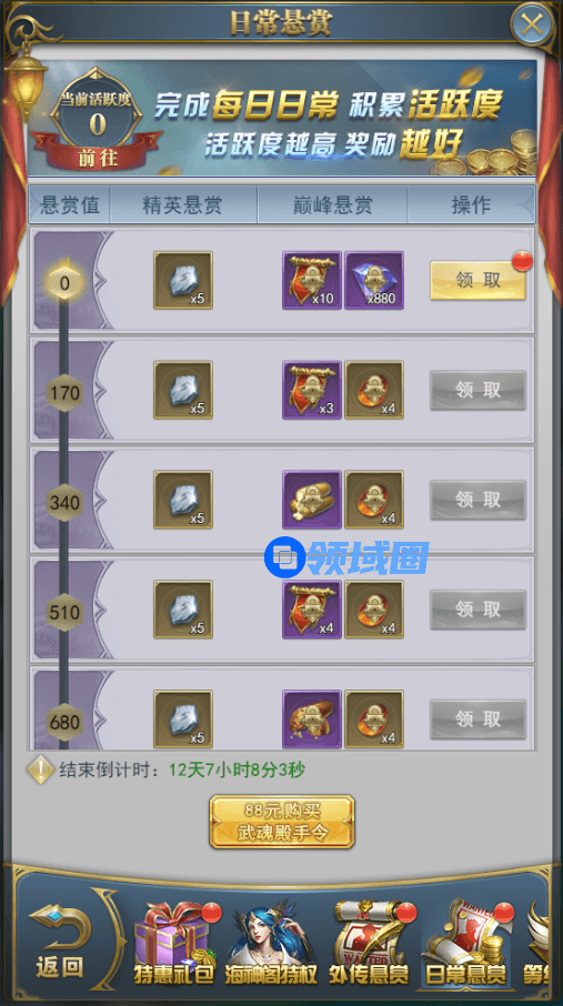 日常悬赏值可通过每日活跃奖励获得。
