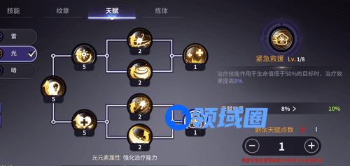 2、既然职业的定位就是治愈系的辅助,那光属性就是比较常规的选择。祭祀的七个技能中,有四个是回血技能,因此选择光属性后,还需要优先将下行的天赋树点亮,下行的治疗强化、圣光涌动强化和圣光回响强化,都能让治愈能力得到大幅度提升,而最后的这个紧急救援,更是能让50%血量以下的队友,在获得治愈时以百分比的幅度提升治愈效果,在多人组队团本时,或者是在多人PVP竞技时点光属性,是比较合理的选择。