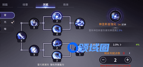 3、那为什么不选择雷和暗元素的天赋呢?先看雷元素,雷元素最主要提升的就是攻击伤害,就祭祀职业来说,伤害型的技能就三个:神圣新星、裁决之眼和连锁天罚,且不说其伤害是高还是低,但专为三个伤害型技能点亮主加伤害的雷属性,这样带来的收益其实并不高,况且祭祀的这三个技能在团战中的伤害并不高,因此选雷属性实属有些鸡肋了,但如果是做单人副本或者是单人剧情,那就可以选择雷属性了,提升完成任务的效率。