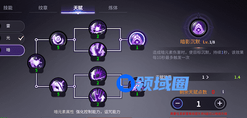 4、最后看看暗属性。这个属性对祭祀来说是几乎可以忽略不计,祭祀的七个技能中并没有指向性的控制技能,同时也没有类似debuff的诅咒效果,虽然暗影沉默和伤口感染都有几率造成一定的软控制,但一个是沉默时间过短、一个是低概率触发,在关键团战中实属太“赌”了,一旦没触发就既有可能陷入下风,因此对祭祀职业来说,最不推荐的就是暗属性的天赋选择了,因此如果是多人团战,那就尽量避免带暗属性天赋进入战斗,如果是单人玩法,试试暗属性天赋的效果也未尝不可。
