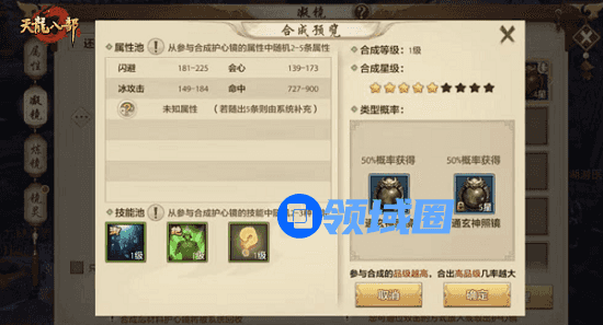 而合成护心镜,能够合出的属性也是有讲究的,若少侠拥有两个2星护心镜准备合3星,但最终3星属性条有且只有3条,也就意味着我们选择合成时,需有一条重复属性。