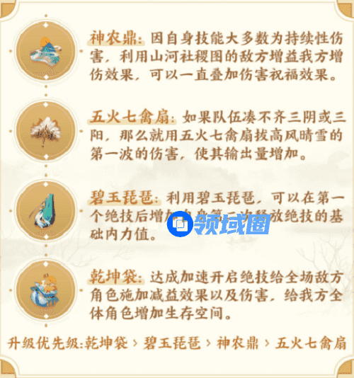 2.五火七禽扇:如果队伍凑不齐三阴或三阳,那么就用五火七禽扇拔高风晴雪的第一波的伤害,使其输出量增加。