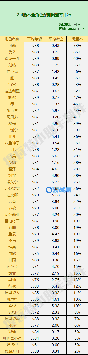 需要说明的是,角色的闲置率并不能代表角色的强度,由于不同版本的深渊环境不同,角色的登场情况也会有所不同,因此本期的闲置率数据只能代表2.6版本的深渊情况。