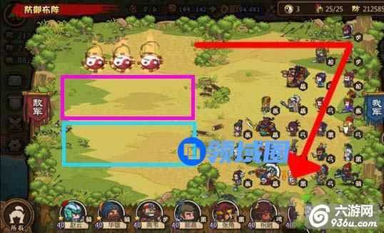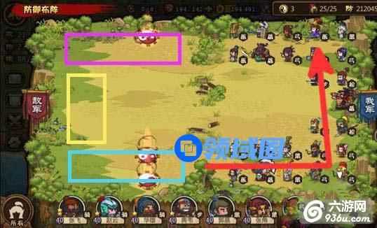 克制方法:红箭头为突破方向,蓝色框体为奶妈集中地,紫色框体为远程火力单位。下路空置(可适当将一盾兵单独放置,许诸最佳,周泰最下路替补)拖延敌正面部队攻伐,掩护我方延着红线突破的部队,上路进攻以计略辅助,借东风压制,美人计控制,骑兵则以华佗术(虎豹骑)辅助。