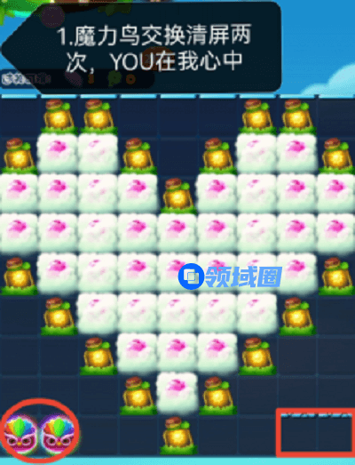 1、魔力鸟交换清屏两次,消除云团收集宝石,U在心中。
