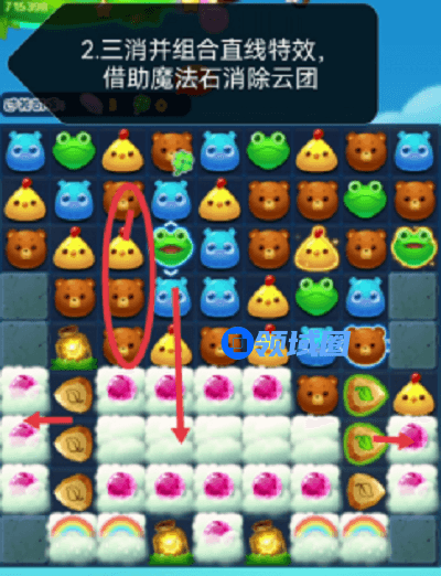 2、三消消除并留意组合直线特效等消除下方云团,激活魔法石可助力消除两侧云团向下拉图。
