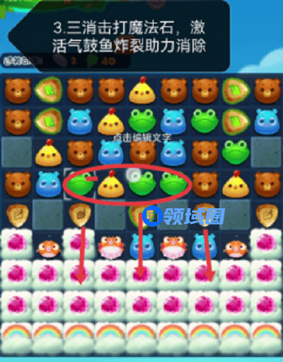 3、三消消除击打魔法石,借助魔法石激活气鼓鱼炸裂消除云团,剩余两行及以下时可继续拉图。