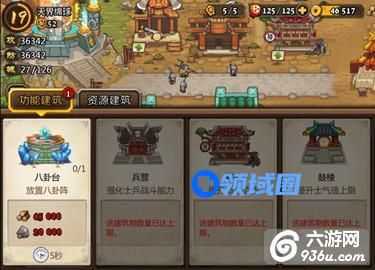 功能建筑物目前一共有五种,分别是兵营、驿站、鼓楼、计略府、八卦台;