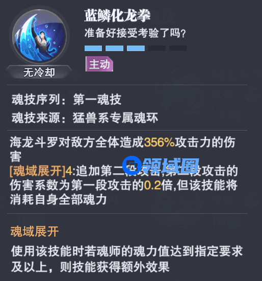2、1-1技能【蓝鳞化龙拳】的核心作用是长图打伤害,特点是海龙的魂力越多,其附加的第二段伤害则越高,但此次伤害会消耗所有的魂力,因此海龙不仅要求其魂力上限要高(需要波赛西的【海神祝福】),还得需要每回合都能回复大量的魂力(需要小白的【海神圣谕】),这也是他为何被称为祝福流魂师的最大原因。