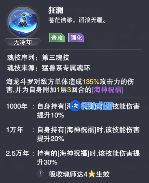 4、接着海龙的3-1技能【狂澜】是一个可以为自身施加【海神祝福】效果的普攻,同时在自带【海神祝福】效果时,其伤害会有一定的提升。