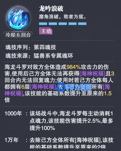 5、最后海龙的4-1技能【龙吟浪破】是一个在长图战斗快要收尾时用来一波流爆发的技能,作为收尾技能来讲,其爆发力从技能描述来看无疑还是非常不俗的。